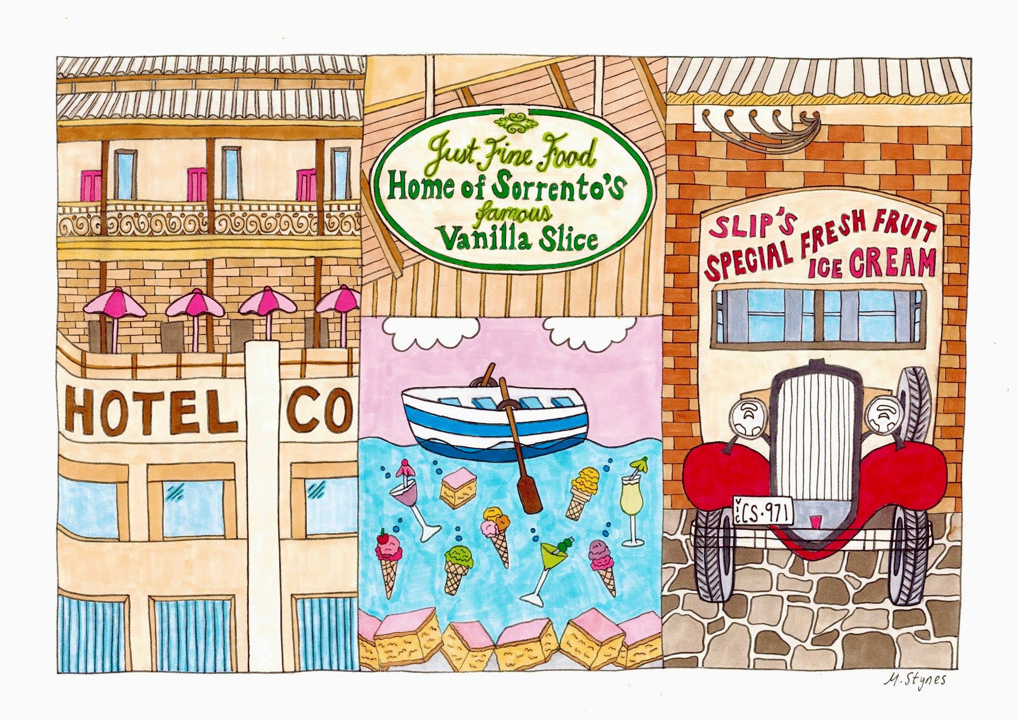 Each print begins as a drawing of a place that holds personal meaning. Taken on my iPhone, a handful of photos are reimagined into a hand-drawn, collage-style composition. Using markers and pen on paper, I bring together three to six images to create a piece that captures the most essential elements of that place.